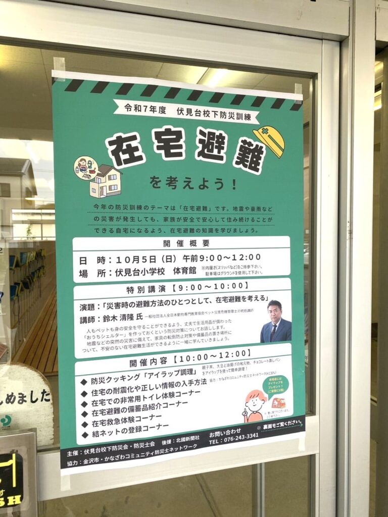 令和7年10月5日(日)午前9時より、金沢市伏見台小学校体育館にて伏見台校下自治会主催の防災訓練が開催されました。