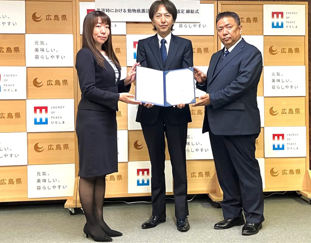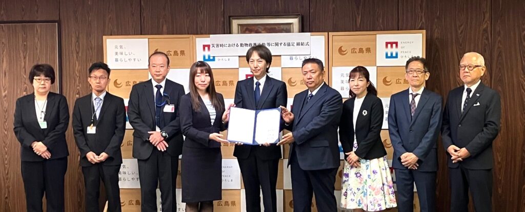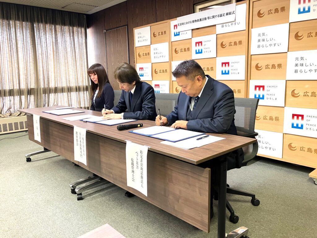 SAEグループの中で、ペット災害危機管理士®の人材教育をはじめ、動物専門教育のエキスパート機関である一般社団法人 全日本動物専門教育協会(所在地:東京都中央区、理事長:大野公嗣、以下「SAE」)、ペット防災の実働組織である特定非営利活動法人 ペット災害危機管理士会(所在地:東京都中央区、理事長:鈴木清隆、以下「ペット災害危機管理士会」)および人とペットが豊かに暮らせる社会創造のため事業を通して人材育成とペット事業者、飼い主へのサポートサービスを提供する株式会社SAEマーケティングワン(所在地:東京都中央区、代表取締役:大野公嗣、以下「SAEマーケティングワン」)は、「災害時における動物救護活動等に関する協定」を広島県(知事:湯﨑英彦)と締結、2025年10月23日(木)に締結式を実施しました。