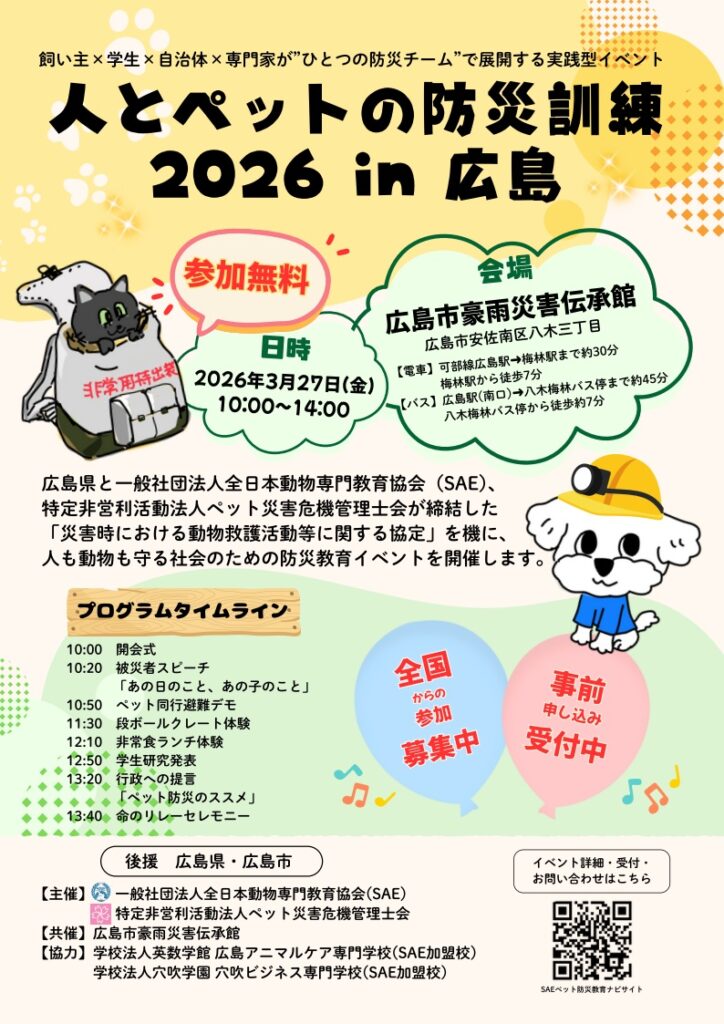 広島県と一般社団法人全日本動物専門教育協会(SAE)、特定非営利活動法人ペット災害危機管理士会が締結した「災害時における動物救護活動等に関する協定」を機に、人も動物も守る社会のための防災教育イベントを開催します。
